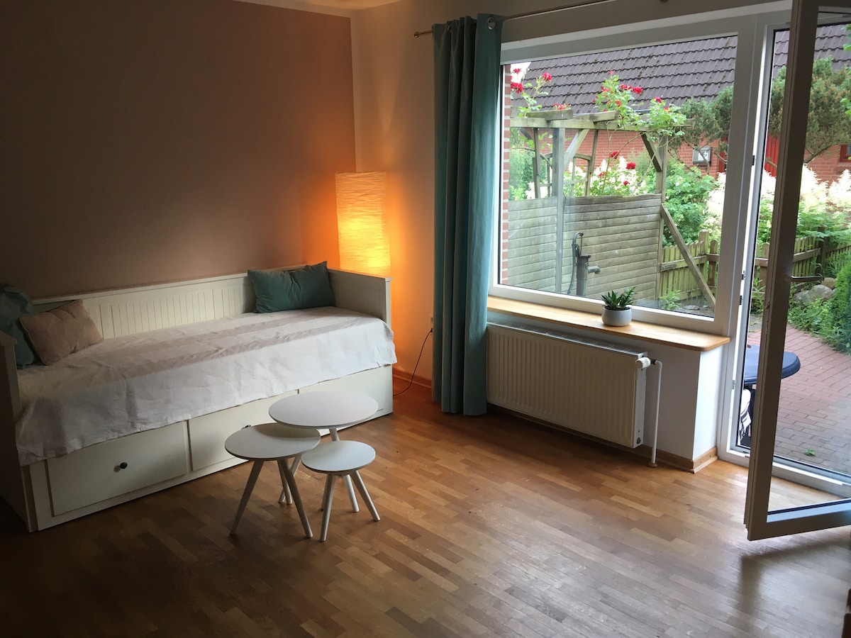 Moin! Va oferim apartamentul nostru rezidential ca cazare privata de inchiriat. Acesta are intrare proprie, bucătărie, cabină de duș și living/dormitor. Este conectat la casa noastră printr-o scară internă. În partea de sus, cu toate acestea, este o ușă care este încuiată. Anunțul are o intrare separată, permițând colectarea flexibilă a cheilor. Prosoapele, lenjeria de pat, Wi-Fi, ceainicul, mașina de spălat vase, șemineul și terasa sunt disponibile. Parcare gratuită la proprietate.