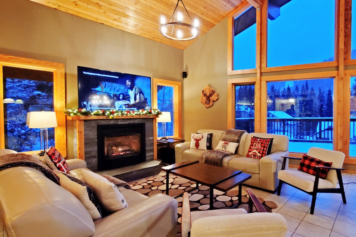 Twin Oaks is a beautiful timber-framed chalet with easy access to ski-in. From the moment you pull in the driveway you'll notice the exceptional design and superb craftsmanship of this stunning home, and it simply gets better when you get inside! From the kitchen, dining area or living room, you've got a fantastic view of the Burfield runs on Mt. Tod across the way. Around the back of the house is your private hot tub and barbeque.