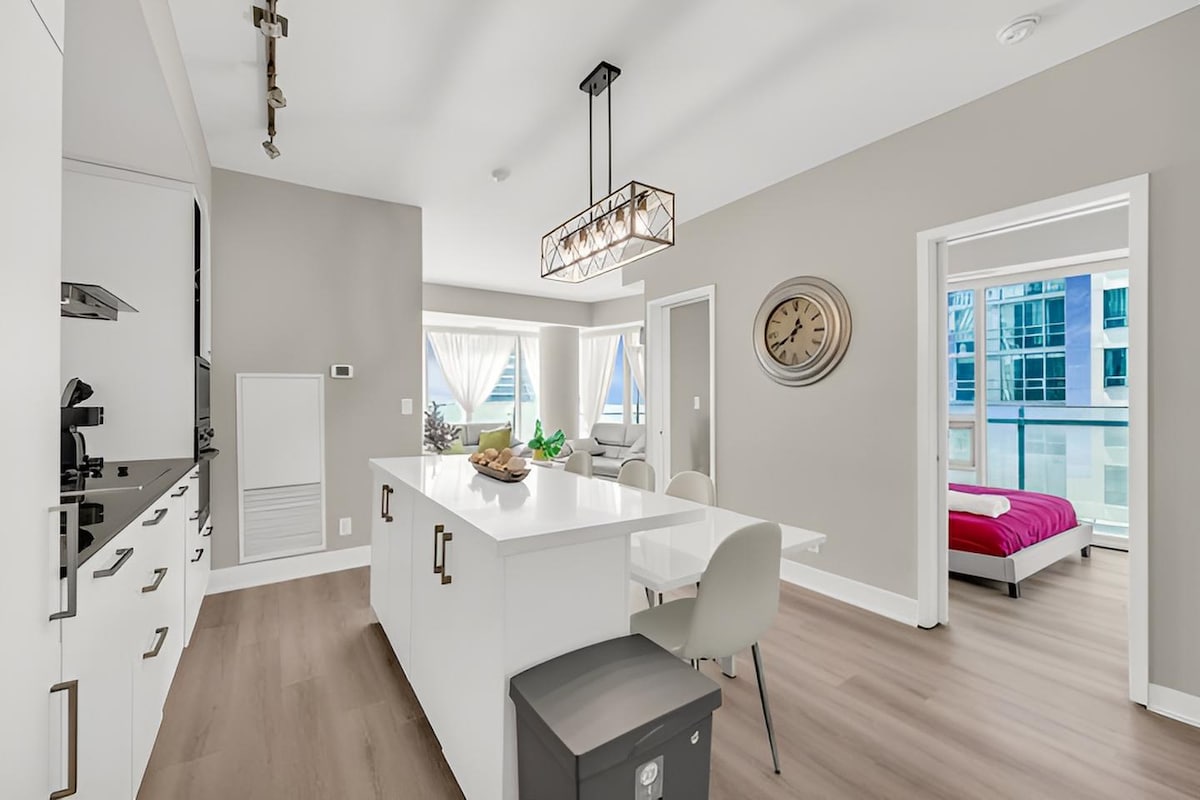 Intră în apartamentul modern și elegant 1BR 1Bath de la etajul 40, chiar în inima centrului orașului Toronto. Promite priveliști panoramice uimitoare ale CN Tower, Rogers Center, lacul pitoresc și multe altele. Explorează orașul înainte de a te retrage în această bijuterie superbă, ale cărei priveliști de milioane de dolari și lista bogată de dotări te vor uimi. ✔ Vedere panoramică spre oraș și lac Dormitor ✔ confortabil cu design✔ deschis ✔ Bucătărie complet echipată ✔ Smart TV Wi-Fi✔ de mare viteză ✔ Mașină de spălat/uscător Vezi mai multe mai jos!