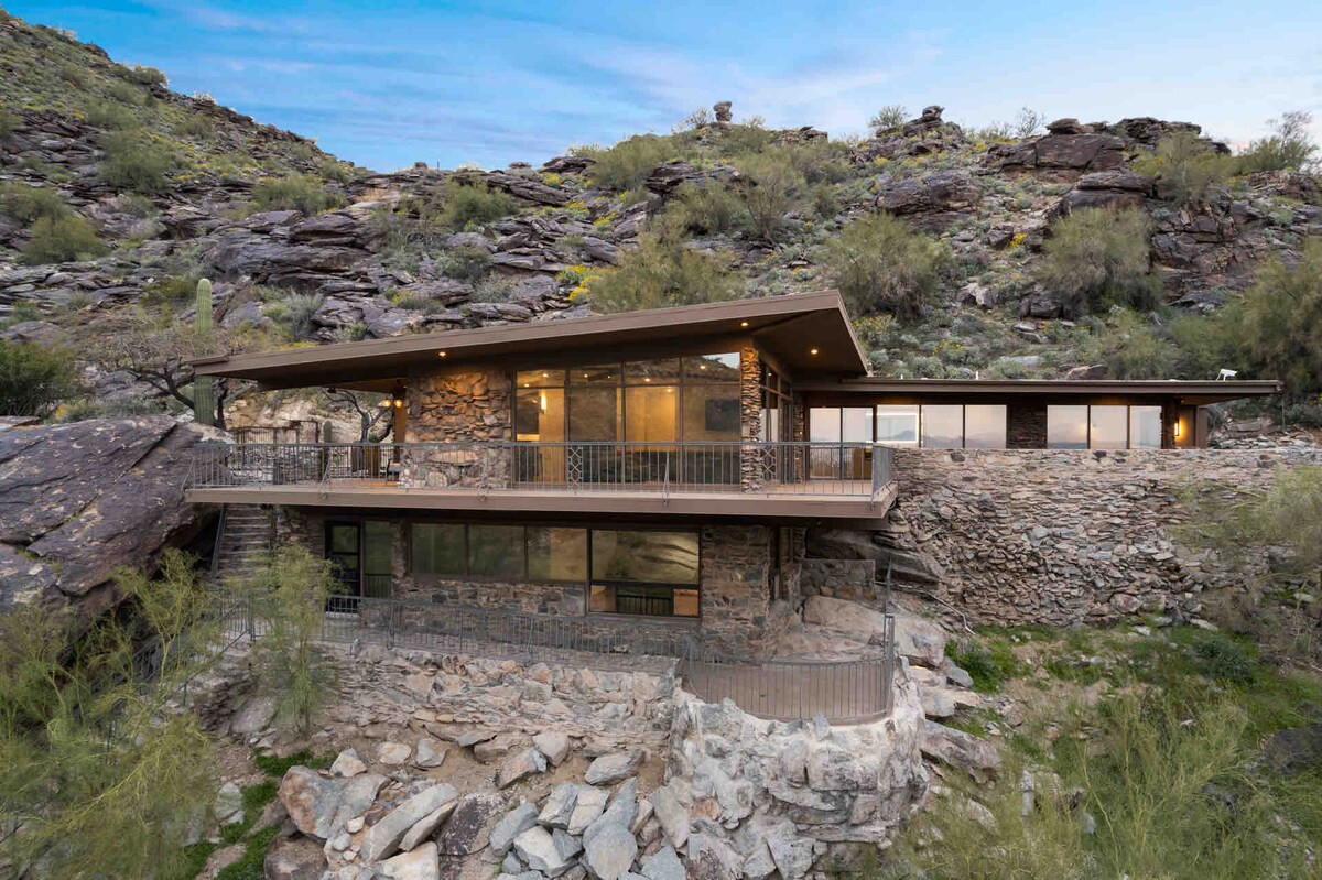Bine ai venit la refugiul nostru recent renovat și reimaginat de pe vârful muntelui! Experimentează una dintre primele cazări amplasate deasupra Muntelui de Sud, oferind o priveliște uluitoare de 180 de grade asupra orașului, Camelback, rezervației și nu numai. Bucură-te de aventură cu trasee de drumeții și trasee de ciclism montan chiar la ușa ta sau bucură-te de relaxare liniștită în timp ce observi fauna sălbatică care trece, ascultă cântece de păsări melodioase și bucură-te de frumusețea captivantă a peisajului montan înconjurător.