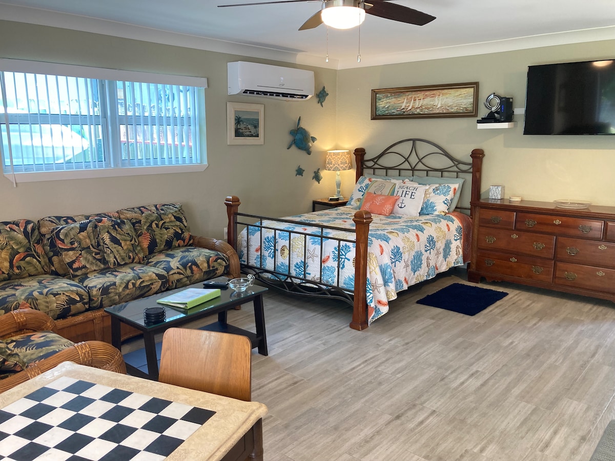O cabană de sine stătătoare fără vecini deasupra sau atașată! Pași spre plajă (aproximativ 900 de picioare), restaurante, viață de noapte și supermarket. Nu este nevoie de mașină pentru vacanță aici. Amplu Tiny Home cu toate dotările de care ai putea avea nevoie. 2019 Renovat Art Deco, 5 unități, clădire tip boutique. Podele frumoase din gresie, perete de glisoare deschise spre un patio frumos cu masă/scaune umbrelă. Wi-Fi, Streaming TV toate incluse. Scaunele de plajă, umbrelele, parcarea și rufele de uz comun sunt toate la dispoziția ta.