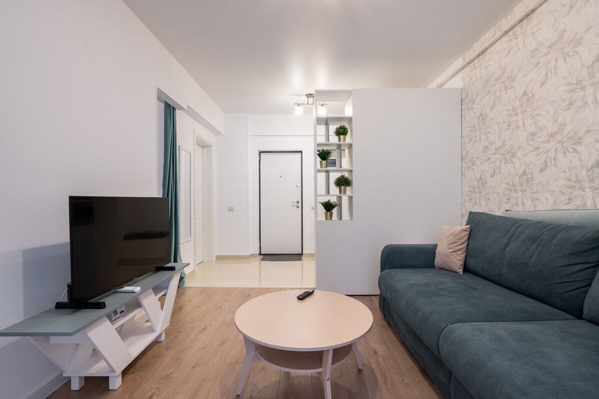 Studioul nostru modern si confortabil, decorat in 2023, amplasat intr-un complex nou si exclusivist, este complet mobilat si dispune de o bucatarie utilata. Internet nelimitat de mare viteza, salteaua special aleasa pentru un somn linistit, cafea si ceai gratuit te vor face sa iti doresti sa mai stai. Localizata in mod convenabil in apropiere de Centrul Vechi, va fi un loc bun de pornire pentru o calatorie reusita. Te poti caza la orice ora doresti, accesul se face in regim self check in.