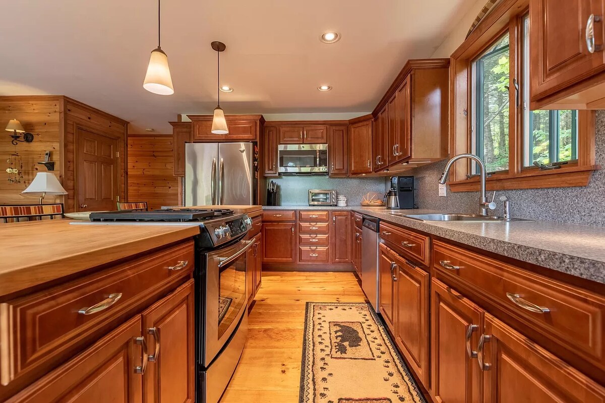 Hot tub. Nature. Total peace. 🌲Acadia Pines Retreat-just 10 minutes from downtown Bangor and close to Acadia National Park. Warm wood ceilings, curated interiors, and cozy moments in the beautiful Maine woods. This retreat features open-concept living space styled with rich textures, soft lighting, and designer touches throughout. Sink into plush seating, enjoy slow mornings with coffee at the stone island, or unwind after exploring surrounded by stillness of forest in your private hot tub.
