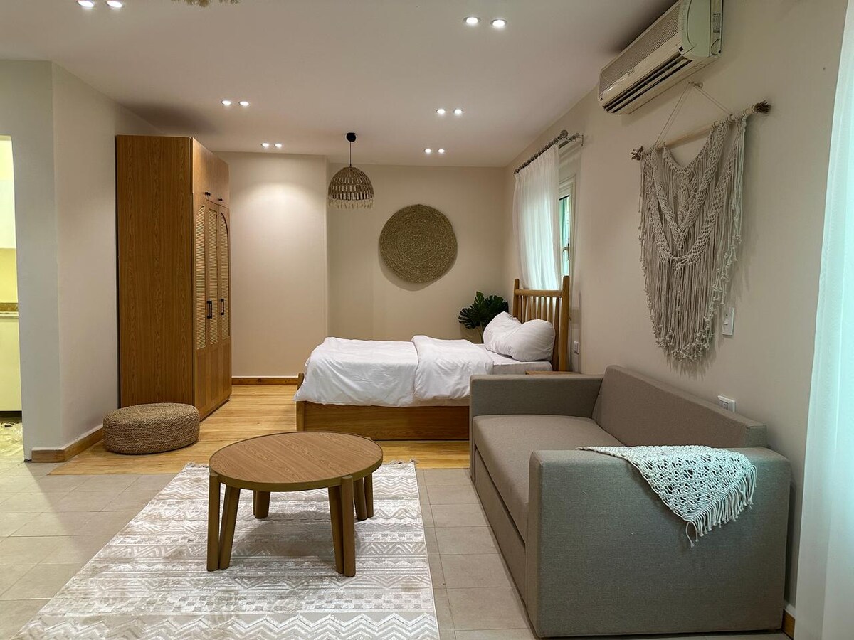 This unique place in North tessein 2 mins from AUC has a unique style. Inside a private compound , one bedroom, private bathroom,2 terrace, a big living room , kitchen , wi fi , smart TV, 2 air condition , free parking , access to the swimming pool. 25 miles to grand Egyptian musuem, few minutes to big famous malls in new cairo ( metro, carefour، Spinneys, lulu market, Cairo festival mall, visitors and alcohols are not allowed