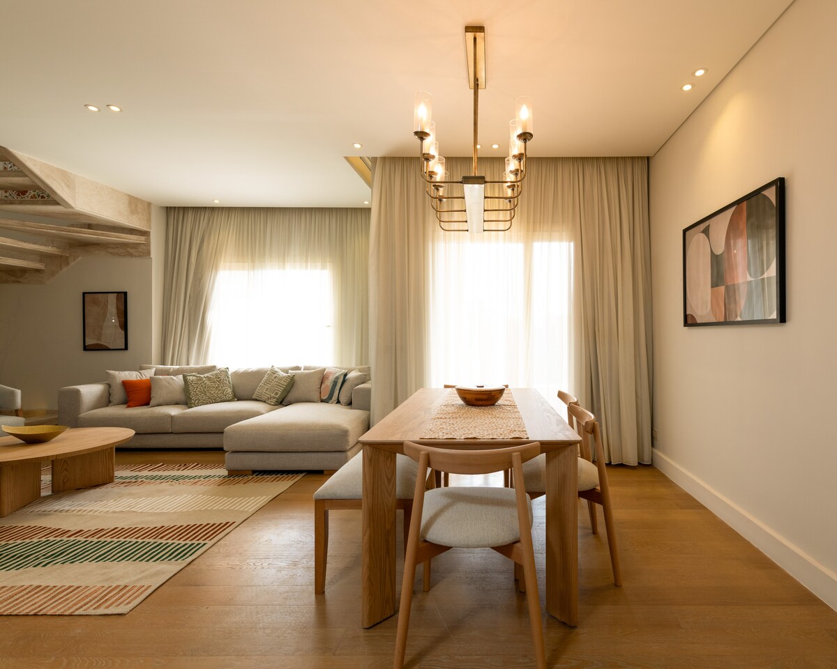 Wake up where everything’s within reach. This modern 2-bedroom duplex in The Village, New Cairo offers a calm stay just steps from Point 90 Mall and directly across from AUC. Cafés, cinemas, banks, and supermarkets are all a short walk away — no driving needed. Ideal for business travelers, small families, or couples who value comfort and convenience.