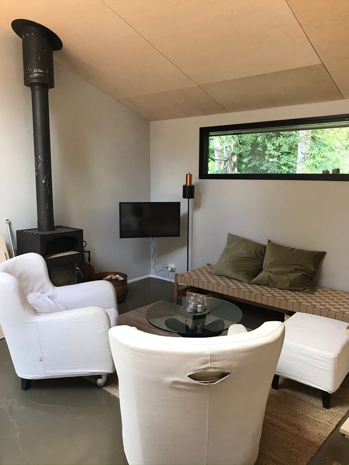 Bjælkehytten med udsigt over eng (45 min til KBH)