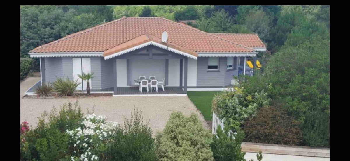 Casă nouă înconjurată de pădure lângă pista de biciclete și plajele de pe coasta Landes Se compune dintr-un living cu bucătărie americană, 3 dormitoare, inclusiv 1 apartament matrimonial cu baie și toaletă , pentru a termina o altă baie și o toaletă independentă. Fibră de internet 🛜 Pentru exterior, o piscină completă spre sud de 4 pe 8,5 m încălzită din aprilie până pe 11 noiembrie, cu grădină amenajată și 110m2 de terasă din lemn. Plajă și golf din Moliets și Maa la 10 minute Vieux Boucau 15mn Hossegor 28mn . Biarritz 50mn
