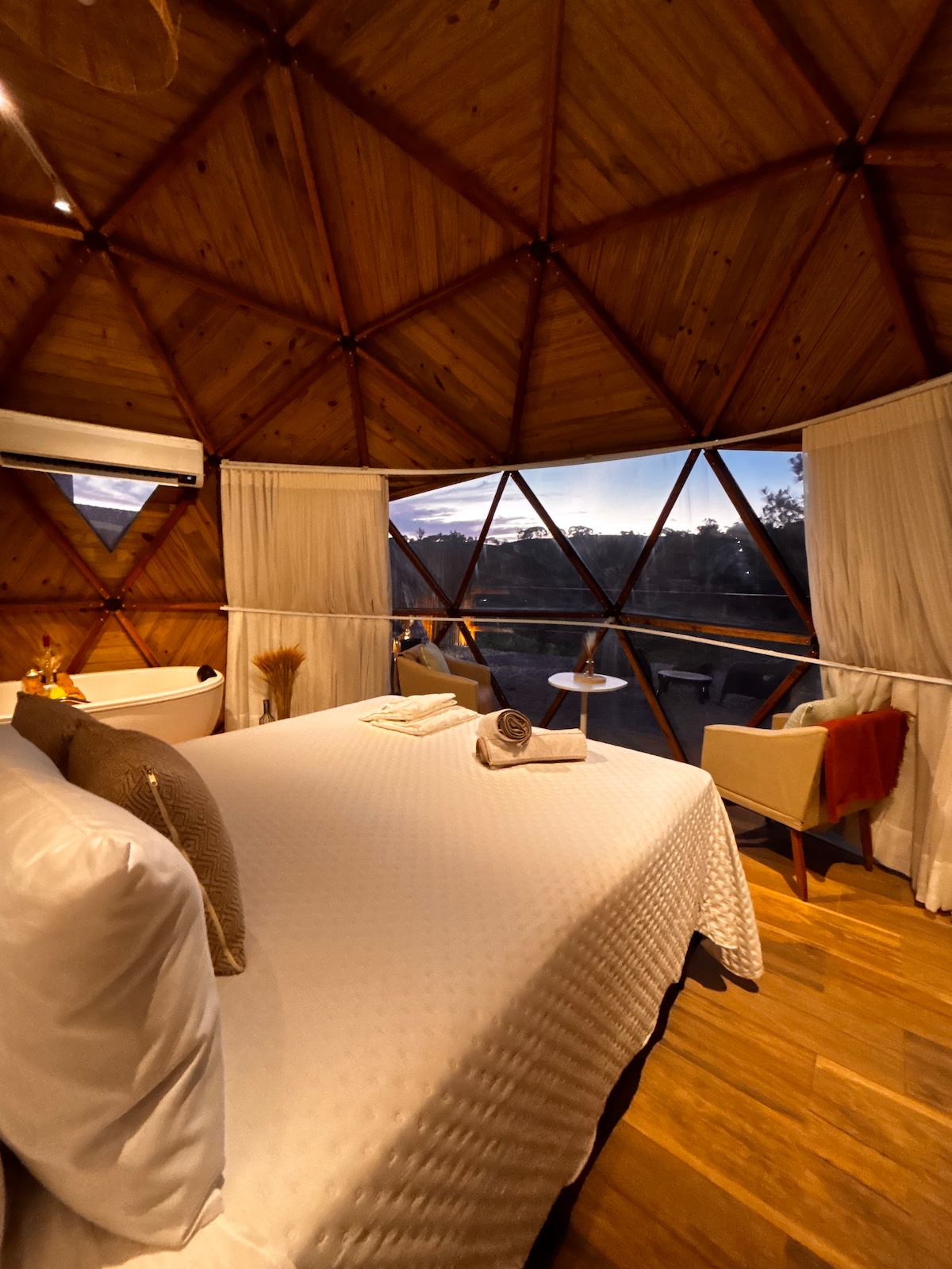 Você vai se surpreender neste lugar único e romântico. Domo Geodésico Intimista para casais para surpreender com uma linda vista para as montanhas e para natureza Com uma decoração sofisticada e minimalista com tema Wine, contamos com: - Café da manhã - Banheira de imersão aquecida para 2 pessoas - Adega climatizada - Fogueira de chão e churrasqueira externa - Lareira - SmartTV 40” - Ar-condicionado quente e frio Samsung - Cozinha equipada - Cama Queen - 10 min de Serra Negra e 5 min Águas