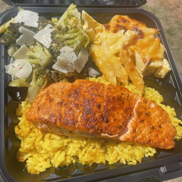 Mâncărurile grele includ bucățele de pui prăjit/înegrit, cotlet de porc prăjit, chiftele sudice, ouă umplute sudice, creveți creoli cu sos de chili și o tavă de legume. Opțiunile de desert sunt mousse sau tort.
