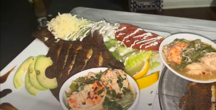 Începe cu un aperitiv: empanadas, ceviche cu mango și lime sau lipie cu porumb. Felurile principale includ creveți sau tacos de pește, pește cu usturoi, pui la grătar cu coriandru și lime, tostados și o selecție de deserturi, cum ar fi churros, flan și tres leche.