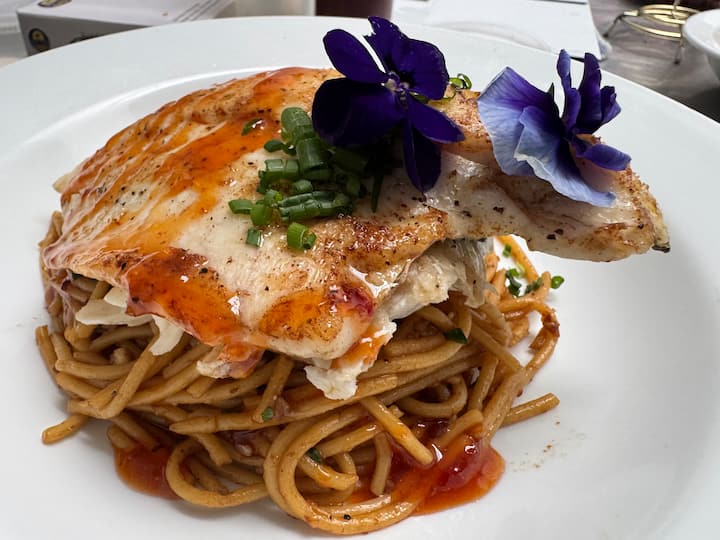 pui crocant prăjit sau la grătar, servit peste o vafă pufoasă cu lapte bătut, finisat cu o notă de zahăr pudră și sirop cald de arțar