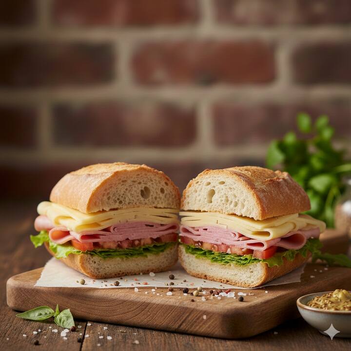 Șuncă și brânză elvețiană > șuncă feliată, brânză elvețiană, muștar cu miere sau maioneză pe baghetă.
