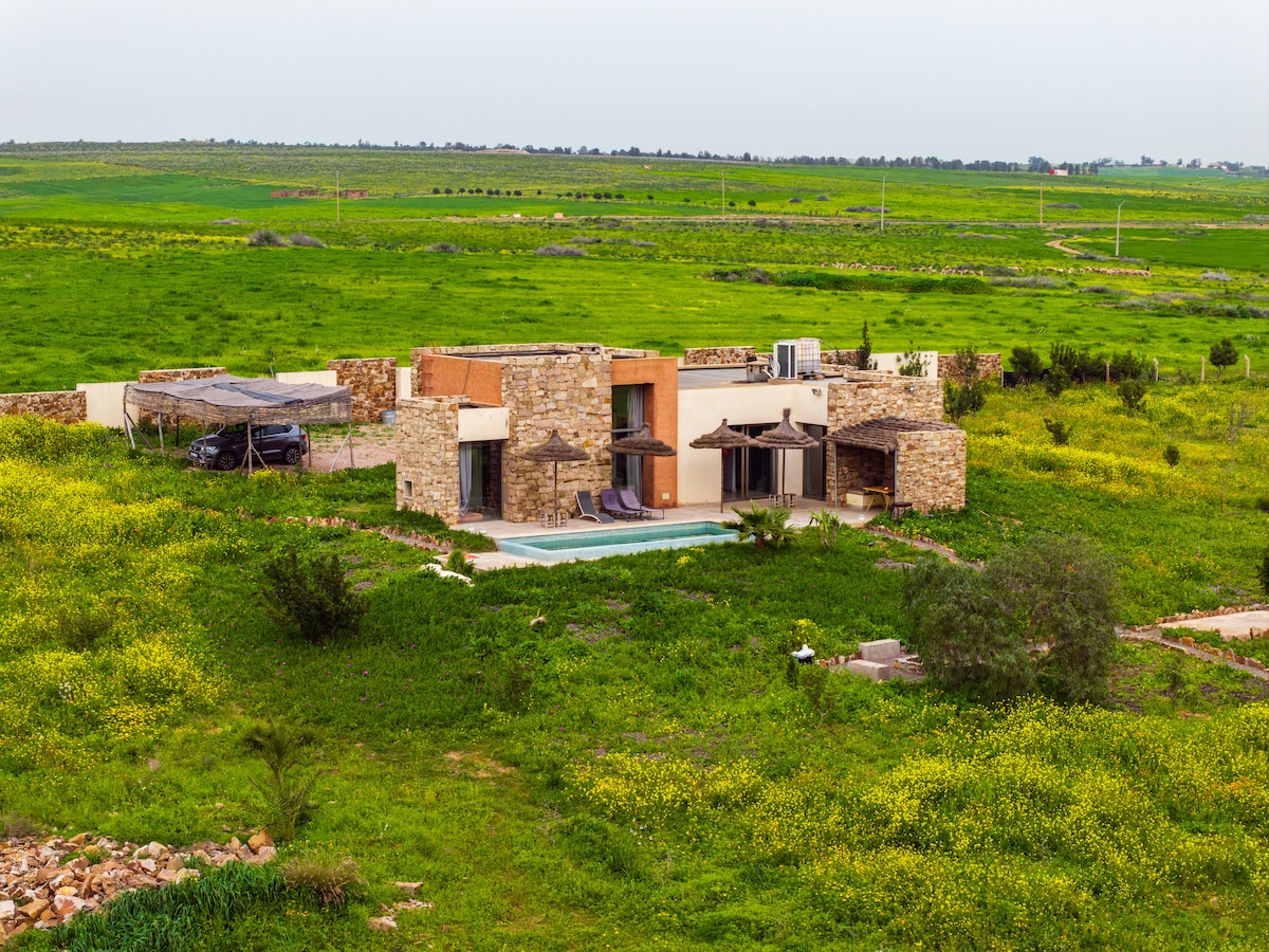Très belle maison de campagne de plain-pied construite en pierre et matériaux naturels. En totale intimité, profitez d'une piscine privée et d'une terrasse entourée d'oliviers. Située à proximité de Settat, de la rivière Oum Errabiâ, de la Kasba de Boualaouan et à moins de 1h10 de la mer, elle est parfaite pour une escapade familiale paisible à la campagne. À 10 min, le village d'Oulad-Said offre toutes les commodités.