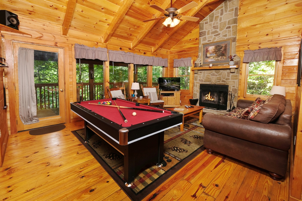 ❤️ Atenție, cupluri! ❤️ Cabană ✔️ confortabilă și intimă - escapadă romantică perfectă ✔️ Priveliști montane uimitoare și răsărituri frumoase Cadă cu hidromasaj și saună✔️ relaxantă Sală de teatru✔️ personală ✔️ Pat matrimonial ✔️ Bucătărie bine echipată ✔️ Șemineu și vatră cu leagăn Televizoare ✔️ inteligente și Wi-Fi rapid Caracteristici ale✔️ apei și iaz Generator ✔️ de rezervă Locație convenabilă 📍25 de minute până la Pigeon Forge 📍20 de minute până la Gatlinburg