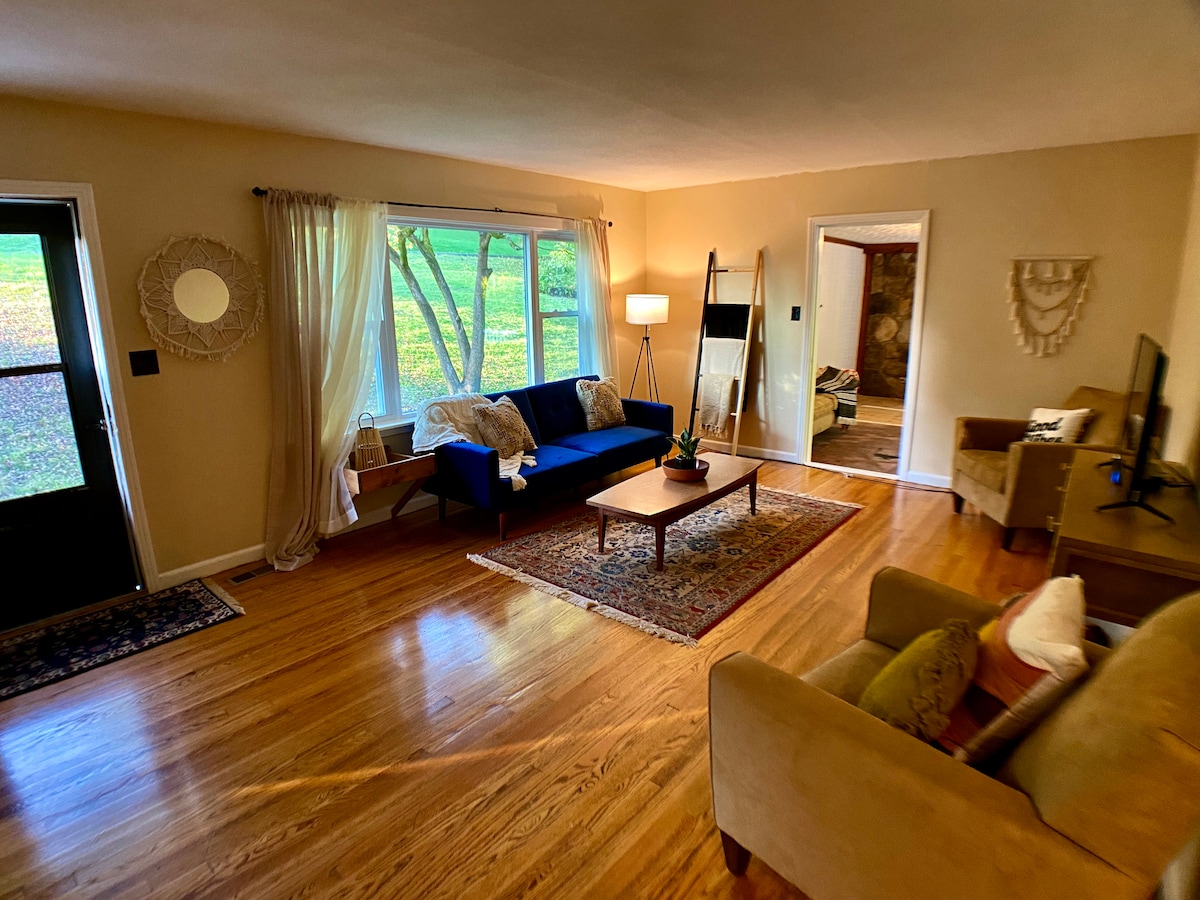 Apartamentul nostru orientat spre sud, strălucitor de curat, cu 1 dormitor la nivelul inferior, este aproape de Knoxville și de Munții Great Smoky: - Mediu fără fumat (pentru întreaga proprietate) - Intrare privată și curte pavată - Baie cu duș spa - WI-FI GRATUIT - Bucătărie completă cu cuptor cu microunde, cuptor cu prăjitor de pâine, 2 plite cu inducție, mașină de spălat vase și frigider - fără aragaz - TV inteligent 4K de 50"cu TV YouTube - Șemineu electric și canapea extensibilă dublă confortabilă - Mașină de spălat/uscător automat de rufe - Sistem și control HVAC separat - Saltea Tuft & Needle Mint