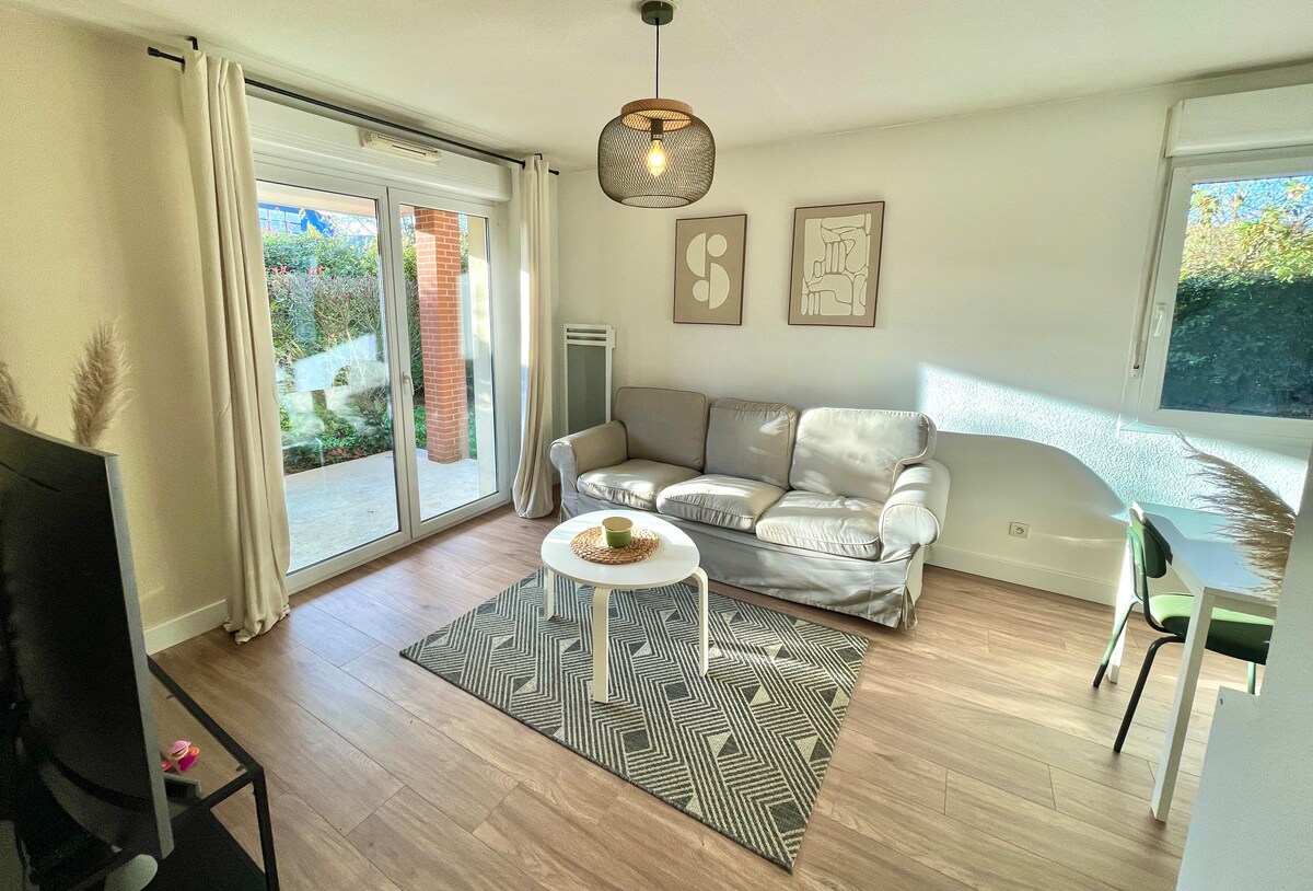 Cazare cu aer condiționat disponibilă începând cu ora 16:00 Așternuturi de calitate! Relaxează-te în această locuință liniștită, elegantă și complet echipată. Te așteaptă o terasă privată pentru luat masa și plajă la soare. Loc de parcare disponibil în interiorul proprietății. Petrecerile nu sunt posibile (zonă liniștită). Maximum 2 persoane. 15 minute de la Toulouse cu mașina. Autobuz spre Toulouse, la 10 minute de mers pe jos: Linéo 11 (stația Collège P.Picasso) 15 minute de mers cu mașina de baza de agrement „La Ramée”.