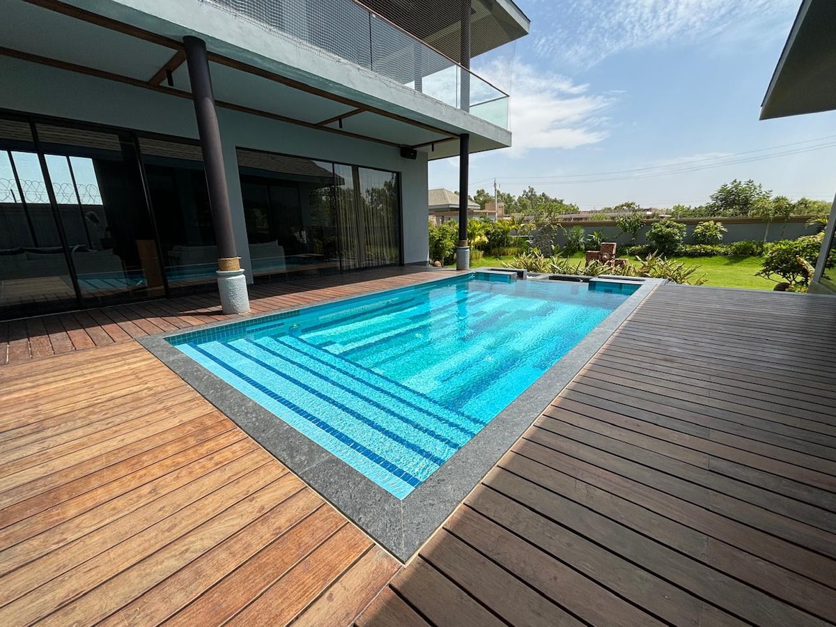 Evadează într-o fermă de 1000 mp, cu două dormitoare mari, cu băi atașate, un televizor inteligent de 65”cu WiFi în salon, un hol cu tenis de masă și o bucătărie modulară modernă cu cuptor cu microunde, cuptor, frigider și masă. Relaxează-te în grădina spațioasă sau mergi senin lângă iazul plin de lotus, vizavi de club. Trezește-te cu cântece de păsări și păuni în acest refugiu liniștit, perfect pentru familii și prieteni care caută natură și confort. Rezervă acum pentru o evadare revigorantă!