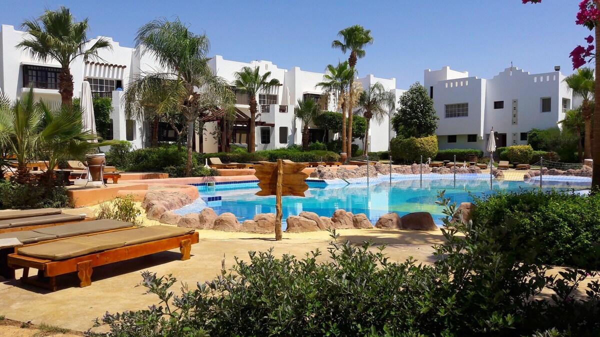 Amplasat în Delta Sharm Village, apartamentul nostru elegant renovat cu un dormitor este un loc preferat de oaspeți pentru designul, confortul și decorul său liniștit. Bucură-te de o scară privată, un balcon însorit cu vedere la piscină și jacuzzi, dotări atente și servicii gestionate de gazde, cu o notă personală. La doar 5 minute de magazine, restaurante, spa, sală de gimnastică și multe altele. Scor de 5 stele de fiecare oaspete: rezervă cu încredere de la Super-gazde cu experiență, care oferă ospitalitate autentică și relaxare adevărată în stil stațiune.