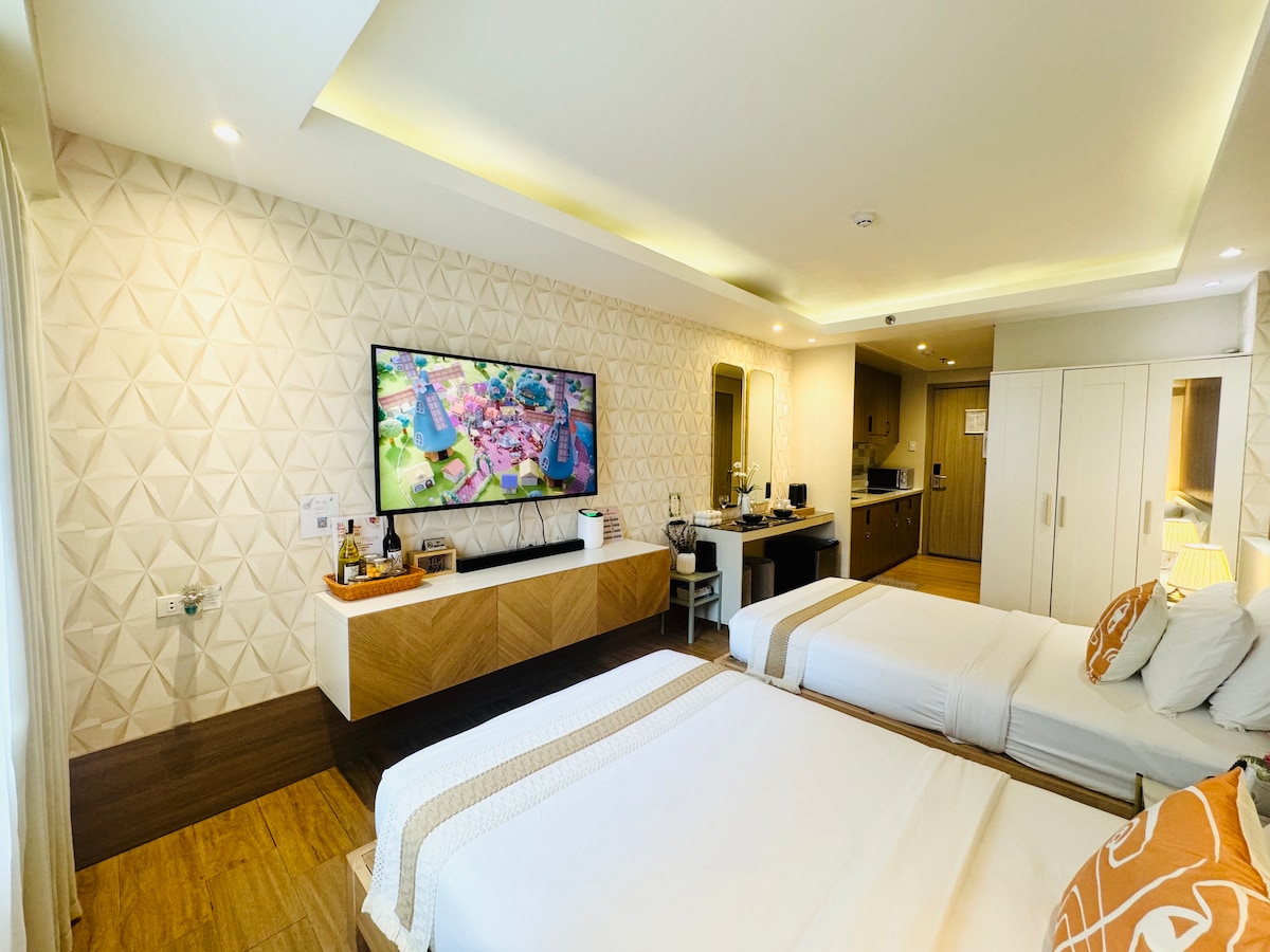 Cazează-te într-o suită tropicală elegantă, cu design interior, cu VEDERE UIMITOARE și NEOBSTRUCȚIONATĂ LA ORAȘ, în Knightsbridge Residences, un apartament de 5 stele situat central în Poblacion. Bucură-te de această suită luxoasă de 40 de metri pătrați, care este MAI SPAȚIOASĂ decât majoritatea micilor locuințe Airbnb de 20 mp din zonă. Situat la etajul 37 cu dotări de 5 stele, bucătărie complet echipată, balcon și tot ce ai nevoie pentru o ședere perfectă: Wi-Fi cu fibră de 200 Mbps, Netflix, TV de 43 inch, piscină olimpică, sală de gimnastică modernă, saună și concierge non-stop