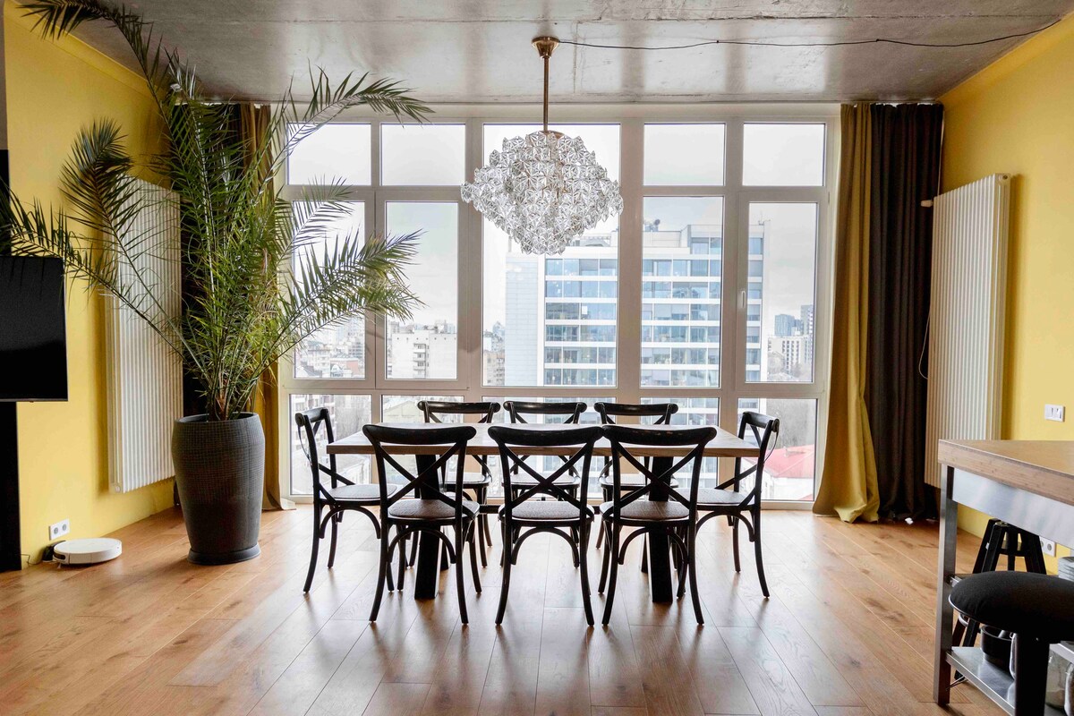Vedere la oraș dintr-un apartament șic cu zgârie-nori în inima Kyivului