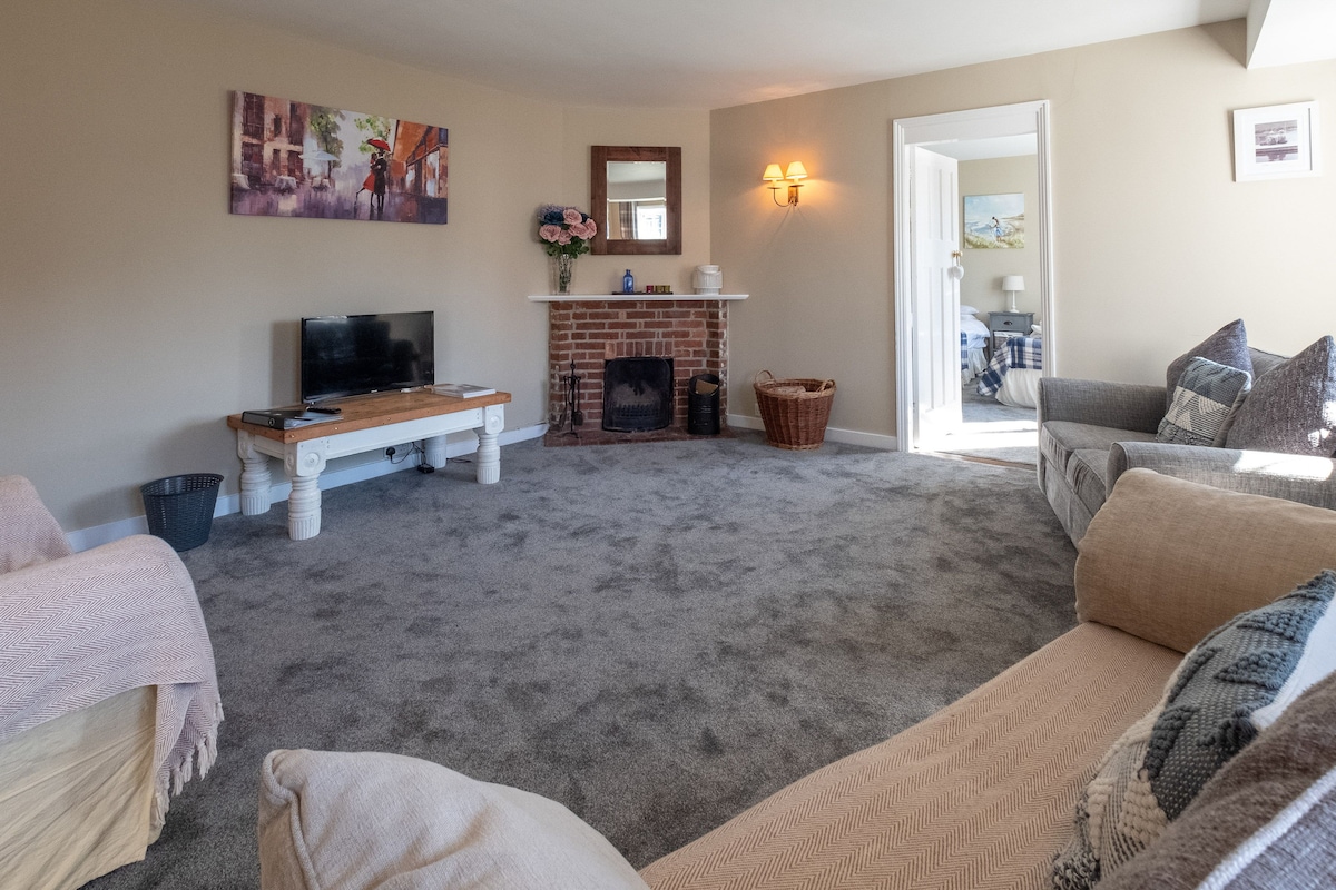 Water Meadow Cottage. A gorgeous 3-bedroom house, comfortably sleeping 6, ideal for families and anyone to unwind in all seasons. With a private south-facing garden full of flowers and birds, and secluded patio with delightful views across meadows. The stunning living room with original beams and bright windows is inviting in summer, and so cosy in winter with its wood-burning stove. Nestled in beautiful quiet countryside, a short drive from the coast, and Aldeburgh, Thorpeness, Orford.