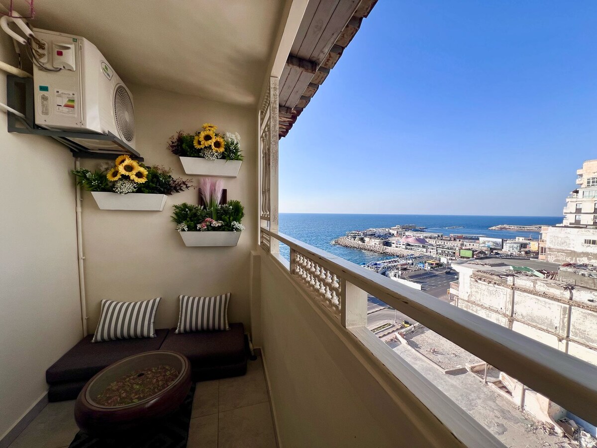 Situat în zona sportivă din Alexandria, acest apartament luxos pe malul apei, cu 2 BD, cu priveliști uimitoare, unde frumusețea Mediteranei se află în centrul atenției, aproape de toate atracțiile. - 2 dormitoare, fiecare cu pat matrimonial. - Living: set de canapele cu 3 locuri (convertibil în pat), spațiu deschis conectat la o zonă de luat masa integrată - Balcon: balcon de 14 mp cu vedere panoramică la Mitterrandian este locul perfect pentru a viziona apusul soarelui - baie de ultimă generație și bucătărie modernă