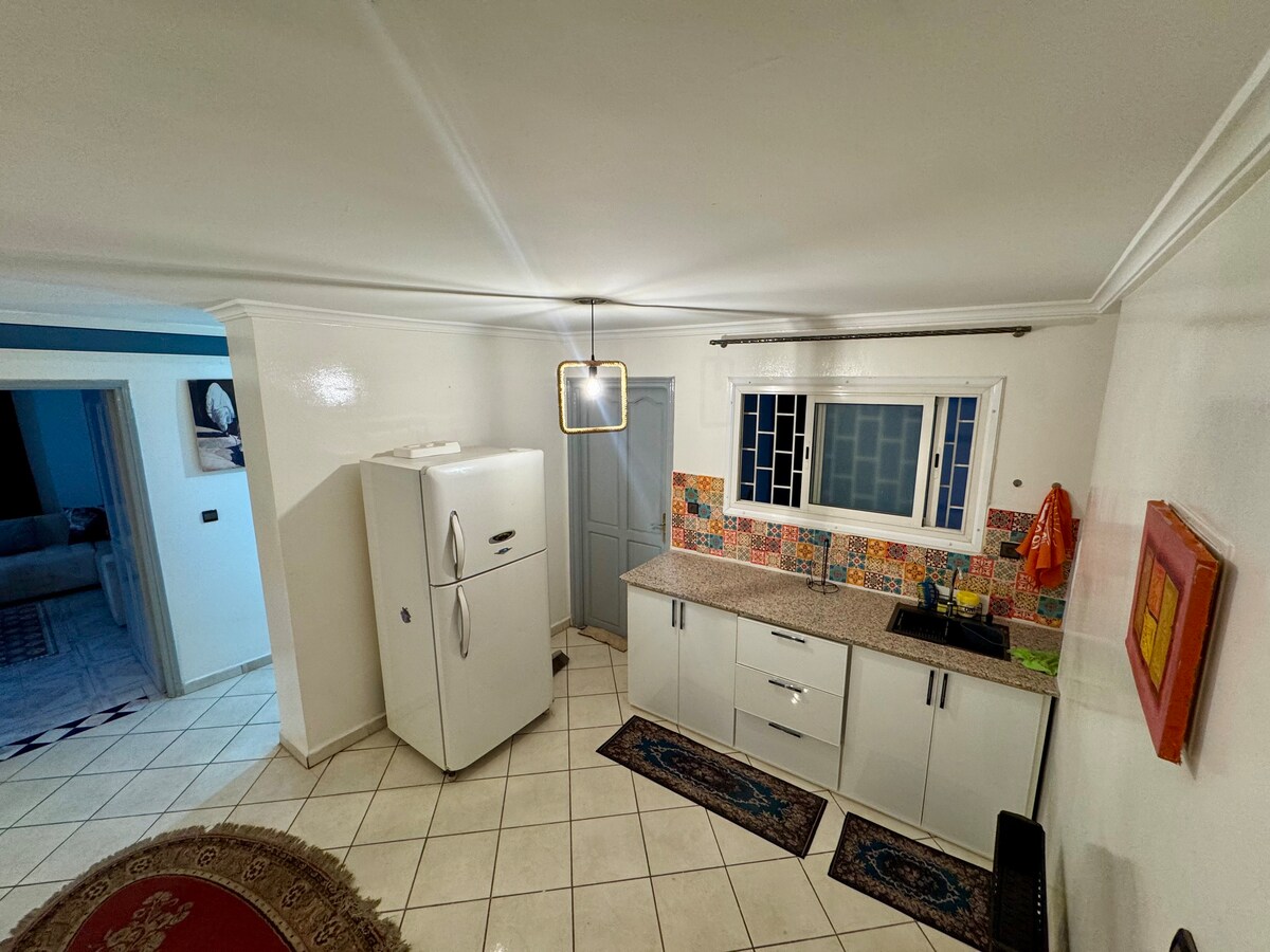 Perfect pentru familii, cupluri sau grupuri de până la 4 oaspeți max. Parcare gratuită în incintă, în interiorul clădirii, sigură, convenabilă și perfectă pentru oaspeții cu mașină. Apartament bine întreținut, cu 2 dormitoare, living confortabil, bucătărie utilată, baie mare și Wi-Fi. Magazine, farmacie, restaurante și supermarket BIM chiar la parter. La doar 15 minute de aeroport, în la câțiva pași de medina și CTM și la 10 minute de cascadele Aïn Asserdoun cu un taxi sau o mașină.