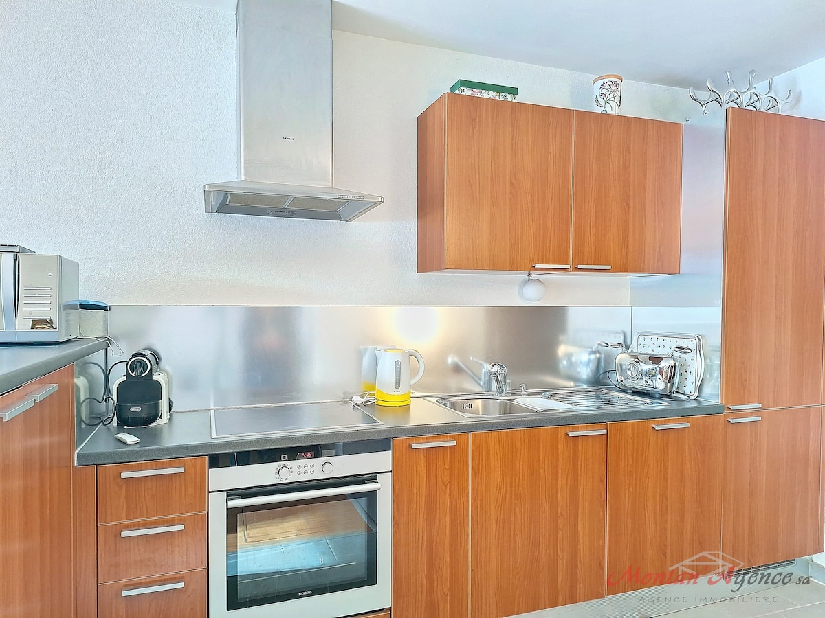Apartament complet echipat 42m2 cu cadă cu hidromasaj, cameră de schi, uscător de cizme. Situat la 20 m de stația de autobuz, care vă va duce direct la stațiile de schi din Crans Montana sau la alte stațiuni alpine din zonă. Paturi cu saltele confortabile: 180x200 160x200 Fondue,raclette set Uscător de cizme de schi Baie cu hidromasaj TV Mașină de spălat cu uscător automat de rufe Internet 1 parcare la 10 m de casă Espressor cu râșniță de cafea Restaurante excelente cu vin local 200-400m Stație de autobuz de 20 m, autobuz de schi