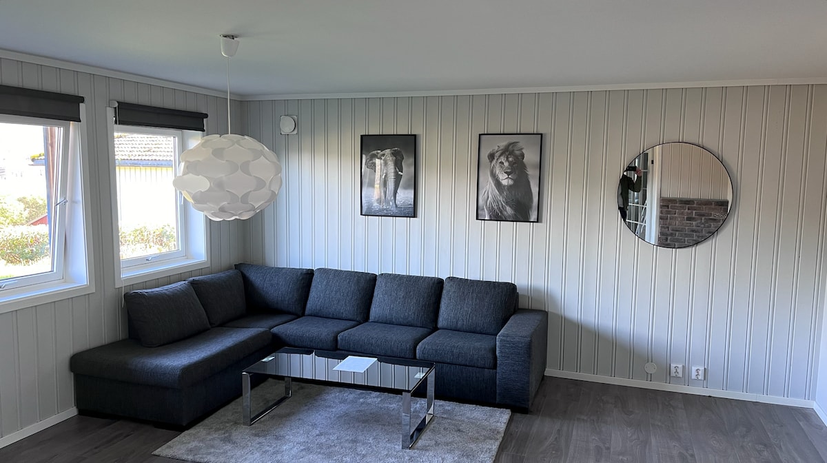 Bright, newly renovated top-floor apartment (145 m²) with insane panoramic valley views! 5 bedrooms, 3 king/queen beds and 2 single beds, hotel linens. Large living room w/ 55" TV, full kitchen (dishwasher etc), modern bath w/ washer. Fast WiFi, free parking. 10 min walk to Skien center. Quiet, pet-friendly, long-stay discounts. Google engineers stayed months & loved it! Books fast!