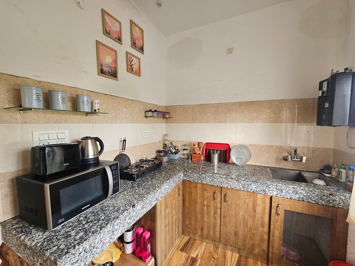 O proprietate independentă 1 BHK, înconjurată de copaci Devdar. Interioarele au fost făcute cu lemn pur Devdar. Are un șemineu interior și toate facilitățile pentru bucătărie - cuptor cu microunde, frigider, purificator de apă RO, fierbător electric, prăjitor de pâine, tacâmuri, gaz, ustensile de bucătărie, râșniță de mixer. Gheizer pentru baie, smart TV, Wi-Fi și sursă de rezervă pentru electricitate. Fără taxă de curățenie. Check-in-ul este flexibil, în funcție de faptul dacă are check-out în aceeași zi. Focul de tabără este taxabil