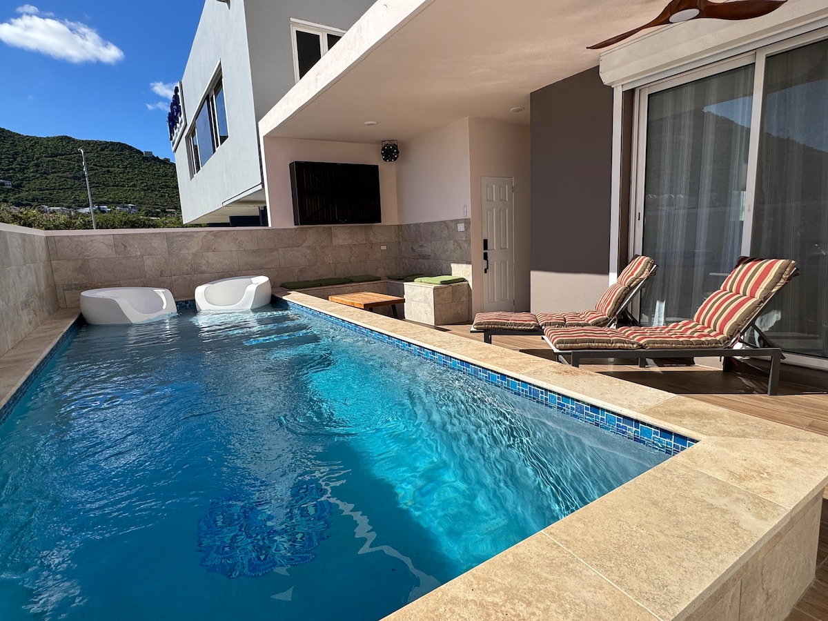 Acest apartament de lux cu 2 dormitoare și 2 băi are vedere uluitoare la ocean și o piscină privată spațioasă, oferind un sentiment de liniște de neegalat. Cea mai mare piscină din cartier. Vedere la ocean de la duș! Gestionat cu atenție de o gazdă de top, fiecare detaliu a fost luat în considerare pentru a ne asigura că șederea ta este confortabilă și de neuitat. Amplasat lângă plajă și la câțiva pași de un bar pe plajă șic, acest loc oferă unele dintre cele mai bune priveliști ale insulei - o oază de frumusețe în inima orașului St Maarten.