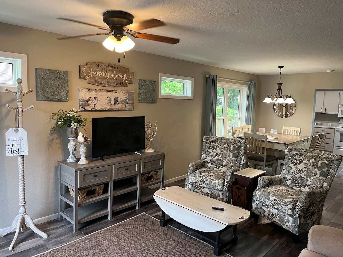 Prairie Rock Suite este un apartament complet mobilat la nivelul inferior al locuinței noastre, situat pe o fundătură la doar 1,6 km est de autostrada 75. Vei găsi fotolii rabatabile, o bucătărie cu o masă ȘI un pat matrimonial care primește recenzii excelente! Prosoapele calde și o baie privată strălucitoare sunt ale tale. Bucură-te de leagănul de pe verandă, groapa de foc, WiFi și Smart TV. Un scaun de birou grozav face ca lucrul de la distanță să fie confortabil. Apartamentul este fără animale de companie și fără fum. Liniștit, curat, privat... apartamentul Prairie Rock! Ne-ar plăcea să te cunoaștem.