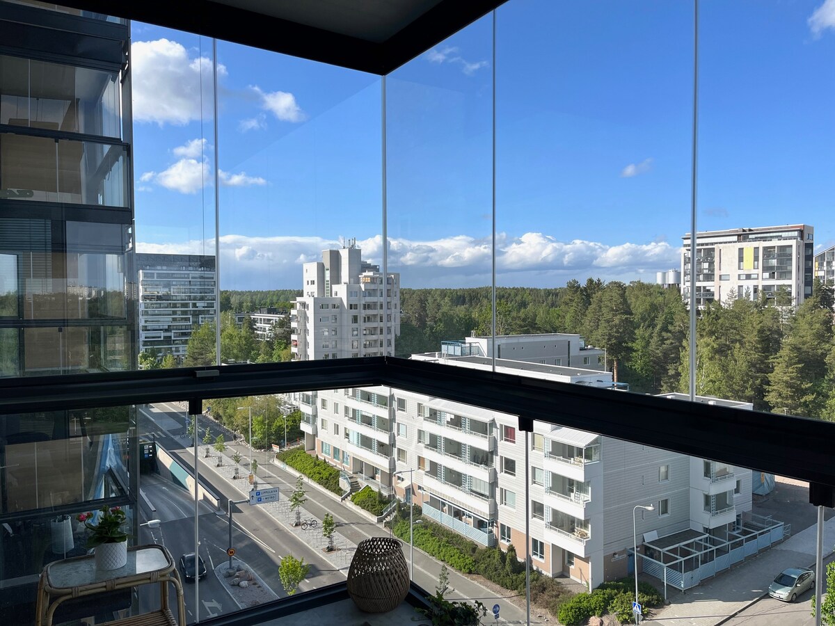 Apartament elegant chiar lângă centrul comercial/stația de metrou Lippulaiva (metrou 27 de minute până în centrul orașului Helsinki). Echipat la un standard foarte ridicat, cu tot ce ai nevoie pentru o ședere relaxantă sau o vizită legată de muncă. - 39 m2, living cu bucătărie, dormitor, baie și un balcon spațios - ideal pentru 1-2 persoane, poate găzdui până la 4 persoane - Wi-Fi de mare viteză, TV - parcare interioară (solicită preț), cu acces facil la apartament