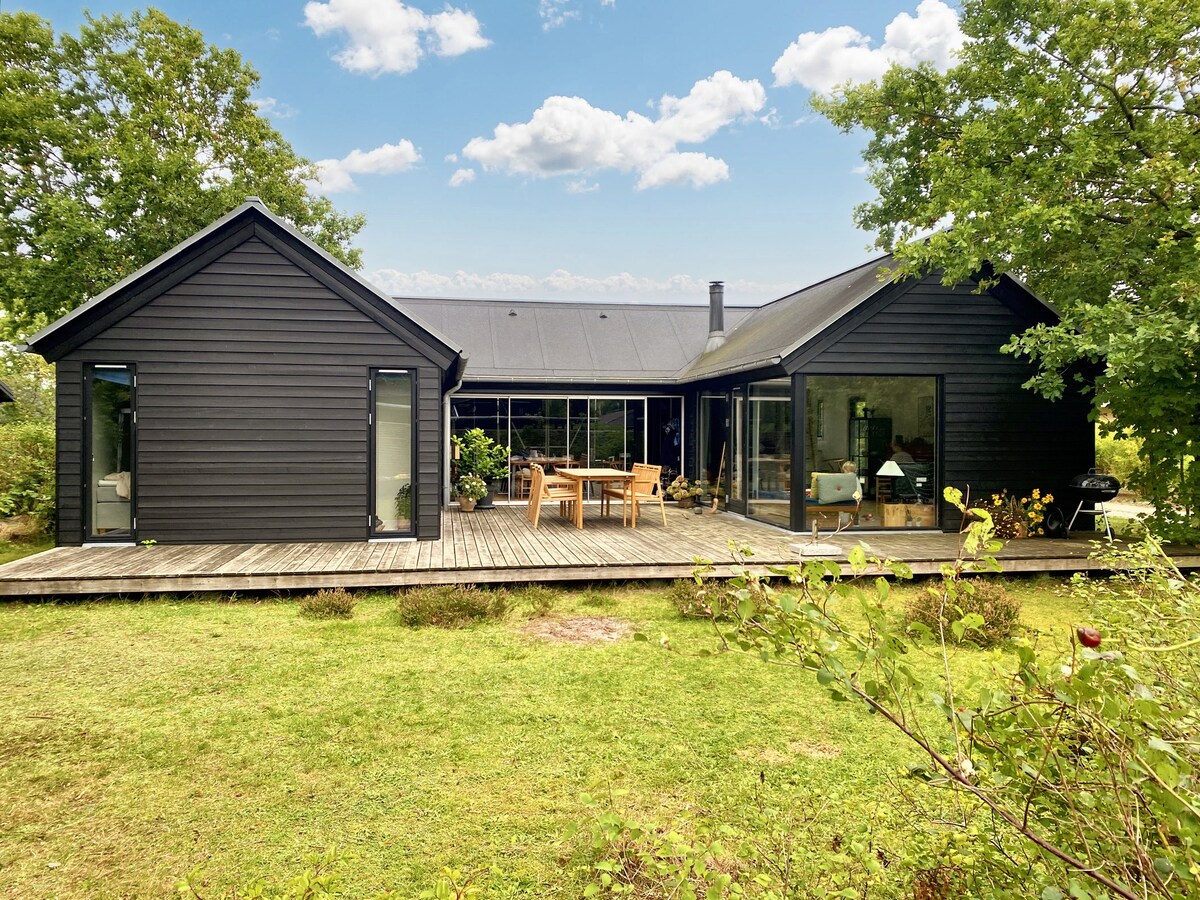 Nyt luksus sommerhus på 115 m2, med 80 m til børnevenlig strand. 3 store sovevær. og to lækre badevær. 50 m2 stort alrum indeholdende køkken med vaske/ opvaskemaskine, spisebord m. plads til 10 pers. hyggelig siddegruppe, brændeovn og stor hems med havudsigt. gæsteafdelingen har egen indgang og badeværelse. Udenfor er der en stor terrasse med læ og sol/lys fra morgen til aften. Huset ligger i tætbevokset, hyggeligt sommerhusområde. Perfekt til 3 generationer, eller to vennepar m. børn
