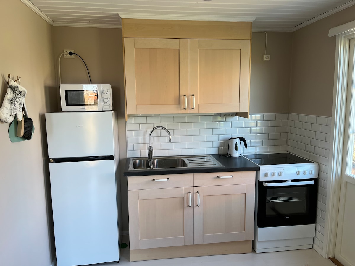 Hjemmekoselig, lite hus for to – peis, ro og natur