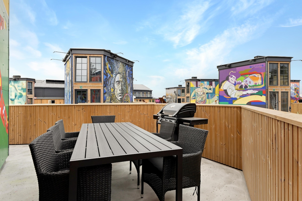 Fun Art in Blokhus is not just an activity park with innovative and unique holiday apartments – it's an experience for the whole family! In addition to the lovely holiday apartments, you'll find everything from a trampoline park and playland to street art and a ceramics workshop, concerts, and more! Fun Art is located in a beautiful natural area near Blokhus and offers fun and entertainment for both young and old. As you move around, you'll find yourself in a universe where talented street artists have painted in their own style on the facades of the modern apartments, and the interiors are designed in the Tiny Houses concept. Linen packages will be ready, with options for room service or dining at Fun Art's delightful restaurant or grilling on the apartment's terraces. Details about the Holiday Apartments: The hotel apartments can accommodate 6 guests with four bunk beds and a double bed – all sleeping spaces are located on the first floor. If you are fewer people, you can fold the bunk beds into the walls, making the space even more practical and adding a cool style. Every square meter serves a specific function, and you'll find everything you need for an overnight stay near Blokhus, right in the middle of an artistic experience. On the ground floor, Fun Art's holiday apartments include a kitchen/living room, a bathroom, and a lovely terrace. Here, you'll find all necessities such as a dishwasher, washing machine, dryer, and grill. During concerts and events, it is truly a special experience to move around in this fantastic universe! Of course, there are also charging stations for electric cars. All apartments are non-smoking. Activities for Everyone! When you rent one of these special holiday apartments, you get free access to all of Fun Art's activities, allowing you to enjoy a vacation filled with both relaxation and experiences. The area offers stunning nature, one of Denmark's best beaches, and most popular holiday towns, as well as Europe's best amusement park, Fårup Sommerland. With so many opportunities for days of diverse experiences, no one in the family will be bored! Combine your beach trip with fun activities at Fun Art – enjoy a quiet moment in the ceramics café followed by a challenge on the football golf course, bounce on the trampolines, or attend a concert in the large concert hall, where you can also dine and enjoy VIP seating on the balcony. At By Sommerhuse, we can confidently say that Fun Art is the perfect place to rent a holiday apartment in Blokhus, taking vacation home rentals to new heights.