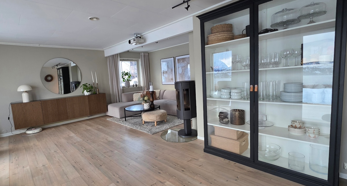 Her bor du moderne og komfortabelt, med panoramautsikt over havet og gode muligheter for å oppleve nordlyset direkte fra terrassen. Boligen kombinerer moderne design med en hjemmekoselig atmosfære. Store vinduer slipper naturen inn og gir deg en fantastisk utsikt. Hjemmet vårt ligger i et rolig området, ca 3km fra sentrum. Gangavstand til matbutikk, fjell og fjære. Egen parkering for bil med mulighet for elbil lading. Dette huset passer fint for deg som reiser med vennegjengen eller familen.