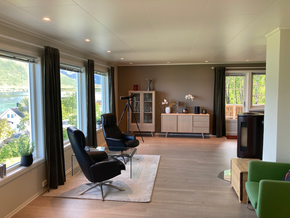 Spectacular new build house (2018) in a lovely, quiet area with a beautiful view to the fjord/sea, mountains and forest in Kvaløya /Tromsø. You can watch the beautiful northern light / aurora borealis from the huge window (10 sqm), sitting in the living room with a cup of tea or coffee in your hand:-) This is a perfect place for tourists who wants to see the northern light, whales in the fjord at winter, hiking/ skiing in the mountains or everything else you want in this lovely city.