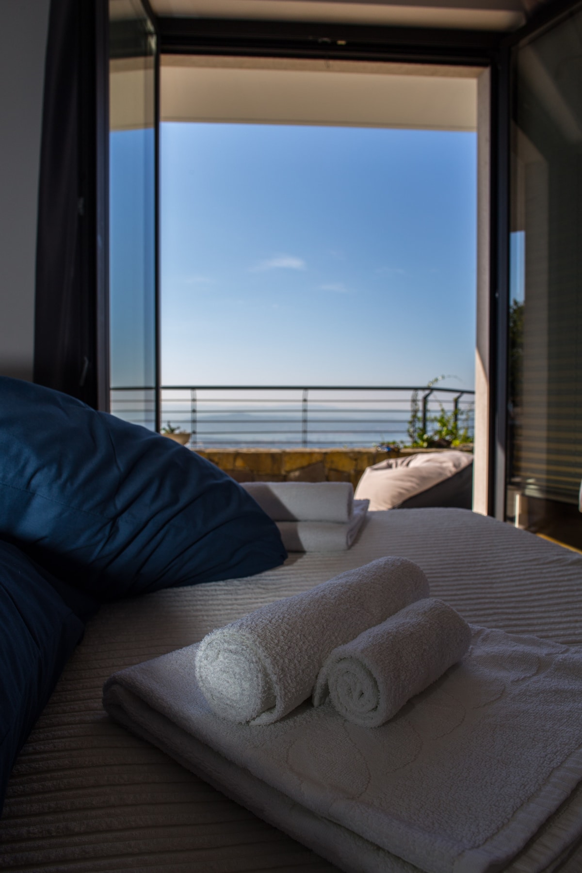 Situato al primo piano, questo appartamento luminoso e accogliente dispone di due camere da letto, un bagno privato e un secondo bagno completo, cucina attrezzata, soggiorno con divano letto e balcone. Vista aperta sul mare e sul verde del Carso. Ideale per famiglie, coppie o amici in cerca di relax e natura.