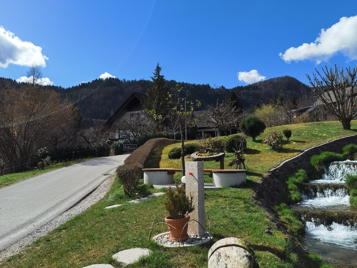 Relaxează-te în acest apartament calm și elegant, înconjurat de o grădină verde spațioasă, cu lacul Bled, este la doar 300 de metri distanță. Recent renovat într-un design alpin modern și confortabil, complet echipat cu tot ce ai nevoie. Acesta include două dormitoare duble, situate la parter, cu acces direct la grădină, unde te poți relaxa în scaune de grădină sau într-un hamac sau te poți bucura de echipamentul de picnic pentru o masă în aer liber. Parcarea este disponibilă în fața casei și este prevăzut un încărcător electric.