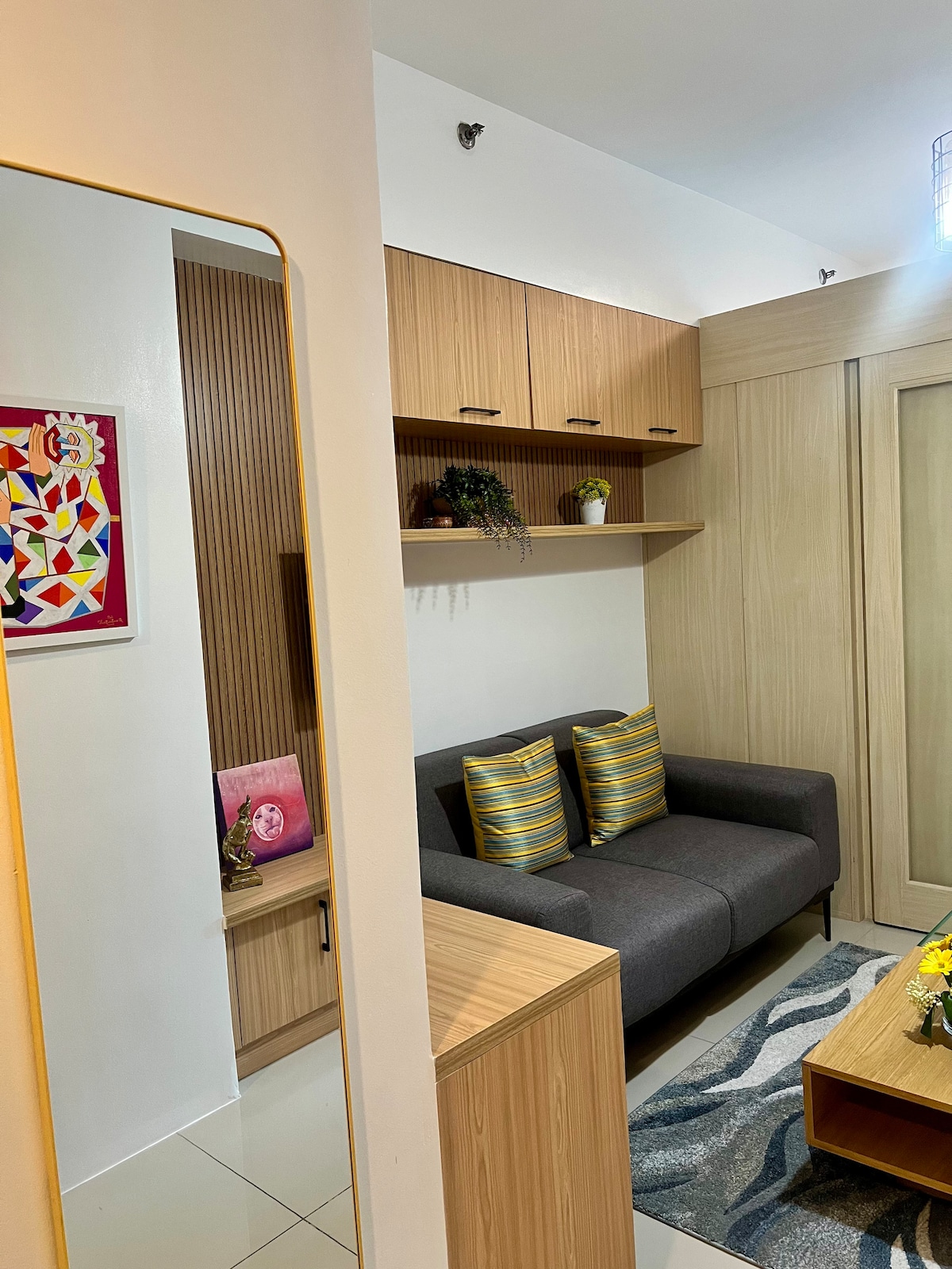 Această unitate confortabilă cu 1 dormitor, cu balcon, este casa noastră personală, recent renovată și situată la etajul 23 al Jazz Residences din Makati CBD. La doar câțiva pași de Jazz Mall, cafenele, baruri și locuri cheie, cum ar fi spitale și centre de testare. Ideal pentru studenții Trident, persoanele care călătoresc în interes de afaceri și șederile de lungă durată. Complet mobilat cu un farmec locuit și o configurație practică pentru muncă sau odihnă. Nu e perfect, dar e cald, confortabil și foarte iubit. Sper să te găzduiesc în curând!