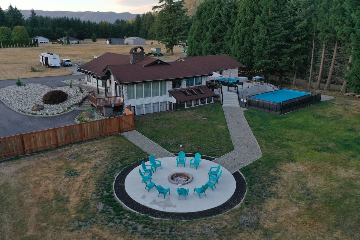 Cabană recent renovată, superbă, pe malul râului, în Munții Cascade, chiar pe râul Skykomish. Bucură-te de priveliști uimitoare ale Muntelui. Indice în timp ce te relaxezi lângă groapa de foc sau pe terasa epică înconjurătoare pentru o cadă cu hidromasaj, duș în aer liber și grătar și te bucuri de spațiul montan de lux din interior: saună, pat matrimonial, pat matrimonial, pat matrimonial, bucătărie nouă și multe altele! 30 de secunde până la cascade epice, 2 minute până la drumeții minunate, 25 de minute până la schi Steven 's. Potrivită pentru animale de companie cu taxă. Rezervă trei cabane de vârf alături pentru crearea de amintiri extinse de grup!