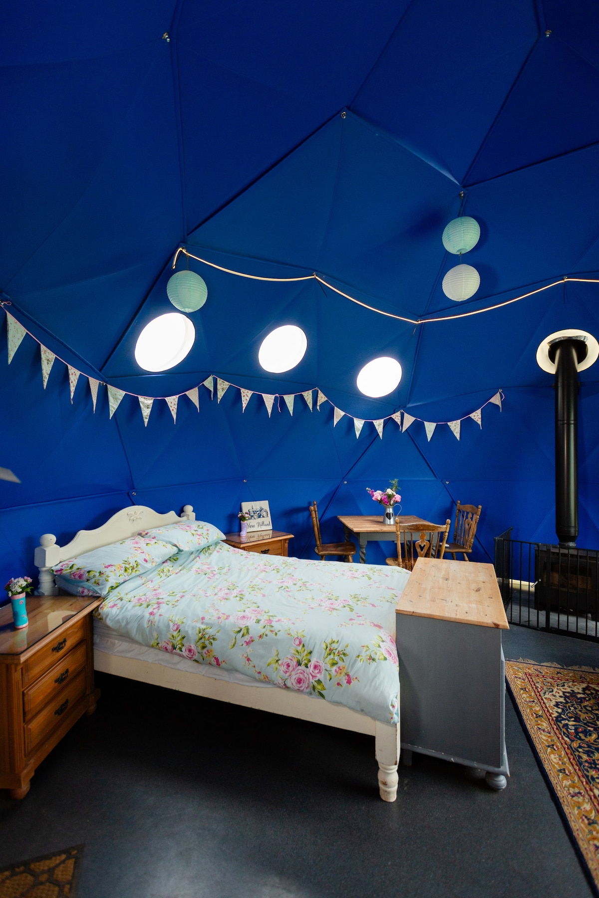 Our Geodome has a wood burner, double bed and bunk beds inside Right next to your dome you have your own wood fired hot tub, private kitchen and flushing toilet, picnic bench and private hammocks. A short walk away you will find a fully equipped communal kitchen including your own fridge and cupboard for storing your food and your private shower room.