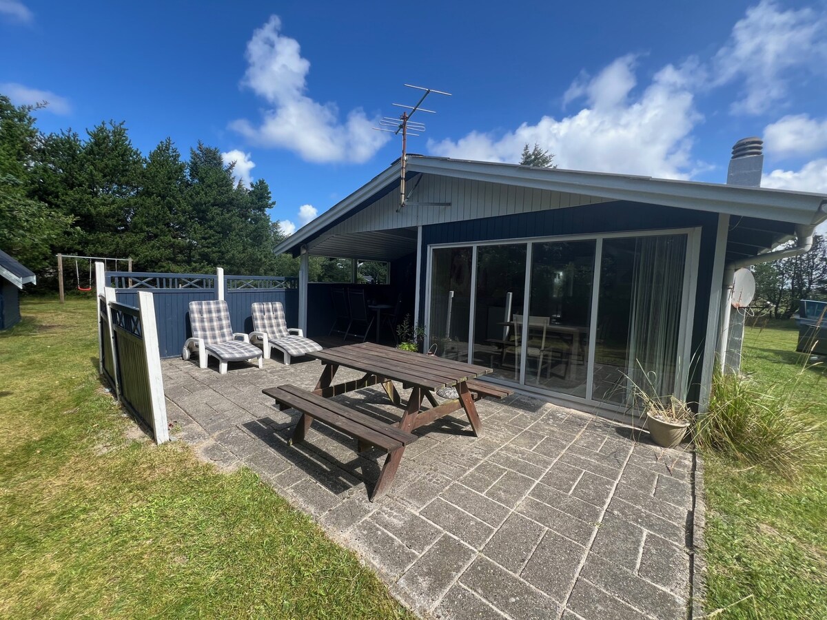 Cabană confortabilă și spațioasă de familie de închiriat. Casa este situată pe un teren natural frumos și liniștit, de care te poți bucura de ferestrele mari ale livingului. Casa are 2 terase mari și oportunități bune de a face grătar în timpul verii. Casa este situată pe o cărare la aproximativ 1,7 km de Marea Nordului și la aproximativ 3 km de orașul Søndervig. În apropiere se află un loc de joacă, un teren de golf, un lac de pescuit și Lalandia Søndervig. Există WI-FI în casă, precum și oportunități bune de a citi o carte sau de a juca un joc cu familia.