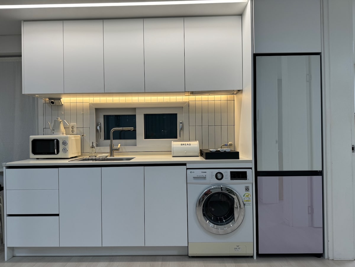 Best location!! Just 2 stops by subway from Seoul station. Yeonnam cafe area is just 1 min by walk and Hongik univ. Station is just 7-10 mins away by walk. Compact space but having all equipment-washing machine, induction cooker, cleaning stuff, etc. Spacious bathroom with rain shower.
