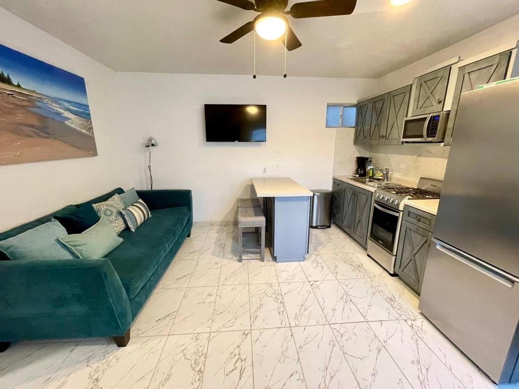 Casita Luna de la El Dorado Ranch oferă intimitate, confort și vedere uimitoare la munte și mare. Bucură-te de propria alee, intrare și parcare sigură pentru 2 mașini. Perfect pentru 2 oaspeți, acest refugiu confortabil are o cadă cu hidromasaj privată, baie spațioasă, aer condiționat rece, bucătărie în aer liber cu grătar, bucătărie interioară compactă, pat matrimonial din spumă, canapea extensibilă, TV inteligent, WiFi rapid, masă/birou, mini-frigider, cuptor cu microunde, vatră și o verandă cu set de luat masa în aer liber. Tot ce ai nevoie pentru o escapadă relaxantă în deșert.