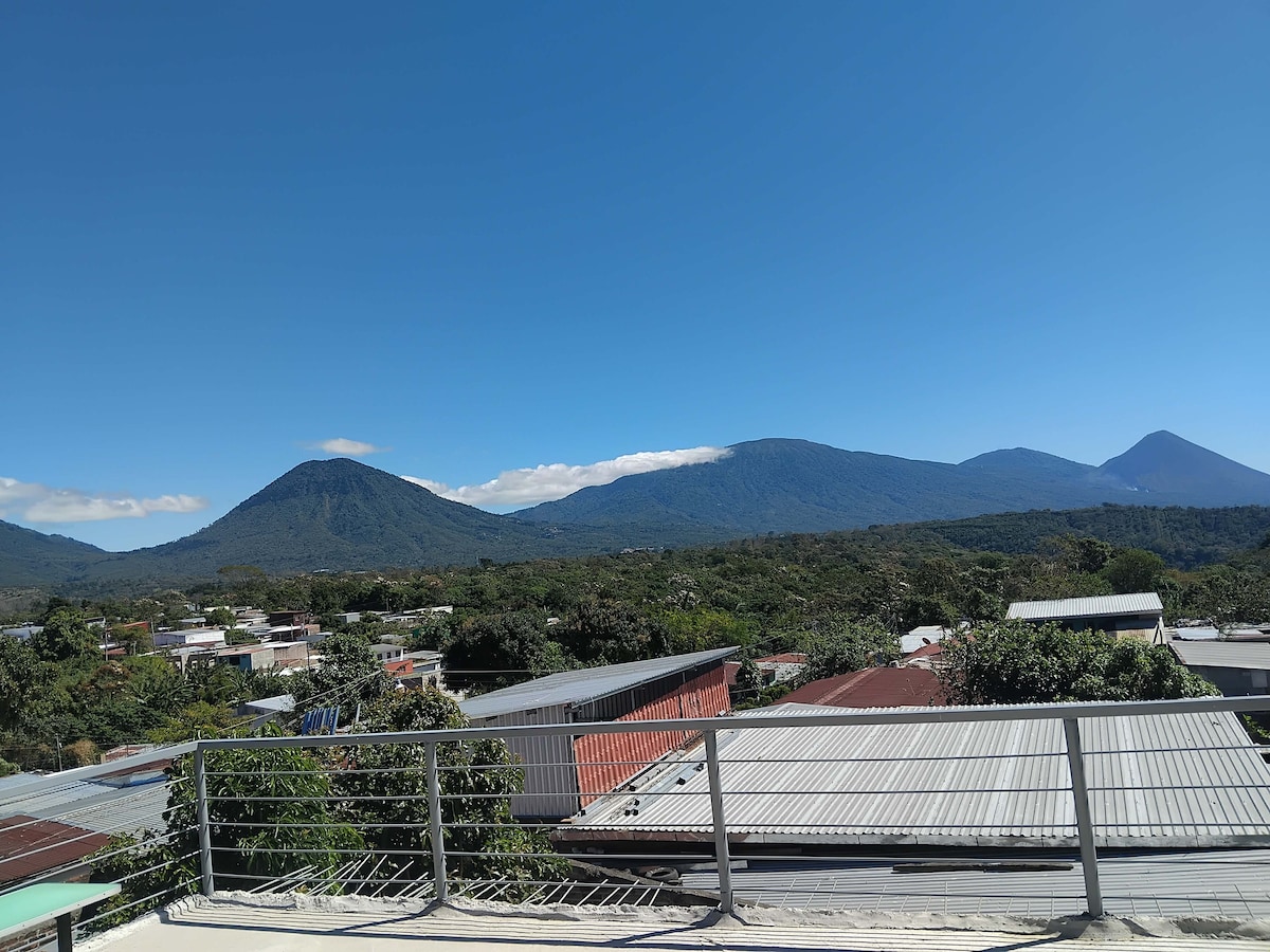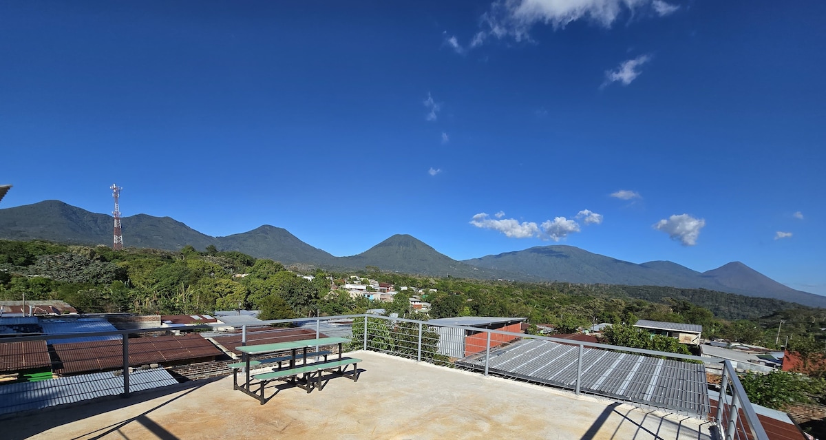 Modern private suite in Los Naranjos with stunning views of Cerro El Águila, a private terrace, backyard, hot water, kitchenette, and breakfast included. Perfectly centered between Juayúa, Santa Ana, Coatepeque, Izalco, and Ilamatepec, plus countless waterfalls. Fresh climate year-round… no AC needed. Ideal for hikers, couples, and anyone exploring the Ruta de las Flores.