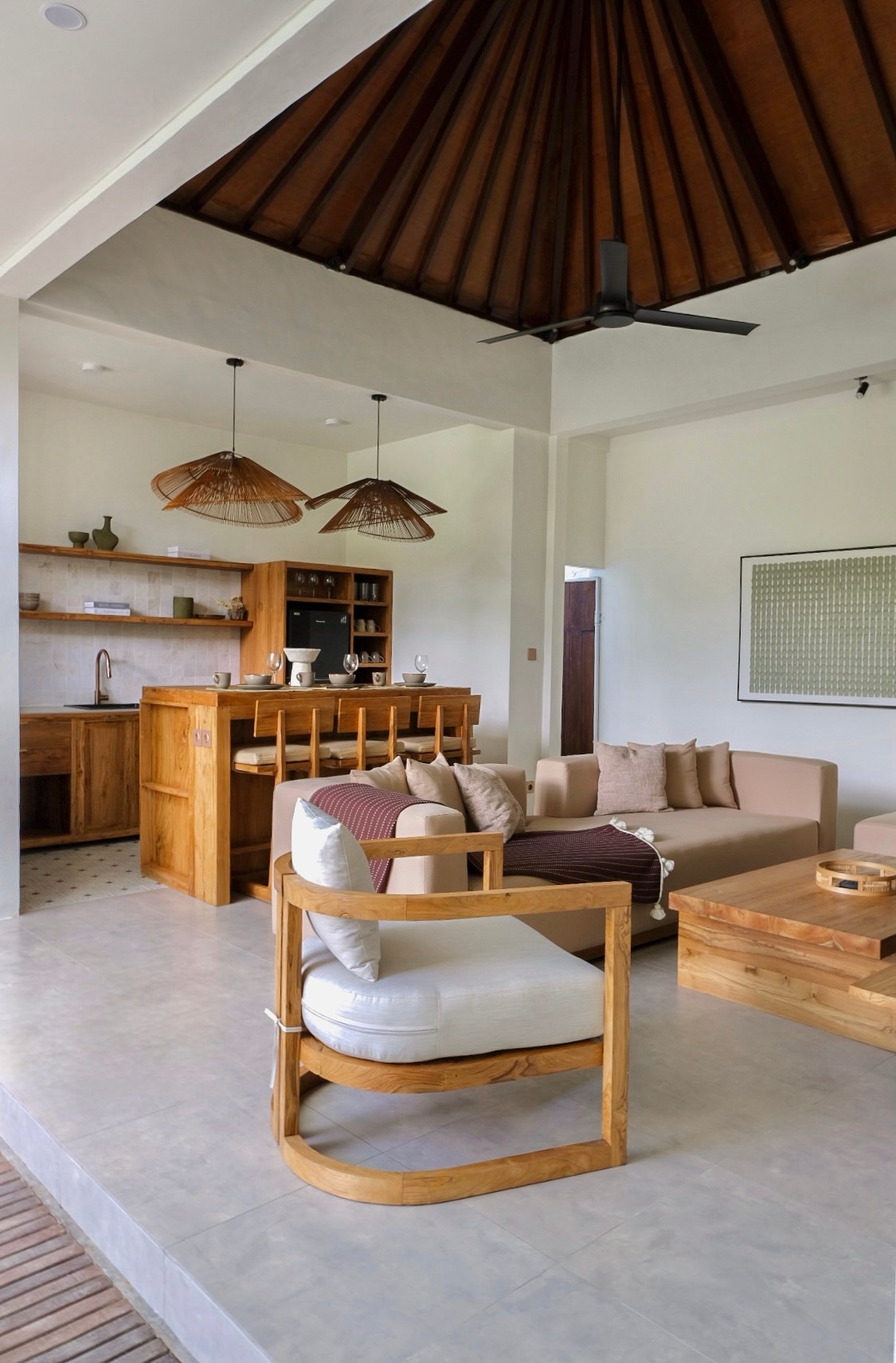 Vishala Retreat Bali cuibărit în Sidemen, Bali, unde casa noastră din bambus îmbină liniștea naturii cu confortul luxos. Dispunând de o piscină privată infinită, un scaun suspendat și un pat de zi, toate perfect poziționate pentru a se confrunta cu priveliștile panoramice uluitoare ale Muntelui Agung și câmpurile de orez în cascadă, acest refugiu este conceput pentru relaxare maximă.
