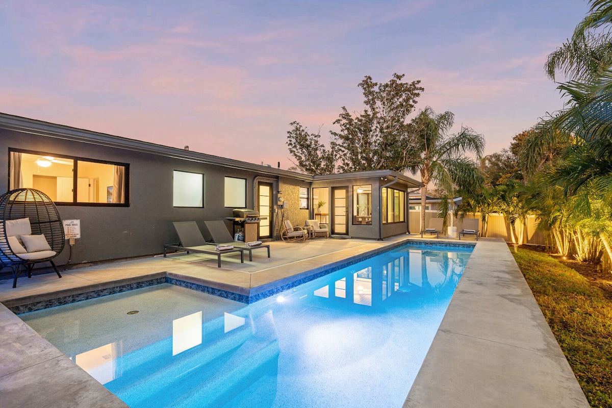 Escape to The Funky Fish House! Your private 2BR/3BD/2BA tropical oasis boasts a heated saltwater pool, bubbling hot tub, outdoor shower, and BBQ grill for endless fun, relaxation, and sun-soaked adventures. Just 5 miles from world-famous Siesta Key Beach and steps from Trader Joe’s, this elegantly renovated, fully stocked, stylish retreat invites families or couples to lounge, entertain, soak up the Florida sunshine, and enjoy the ultimate Sarasota vacation in absolute comfort and style!