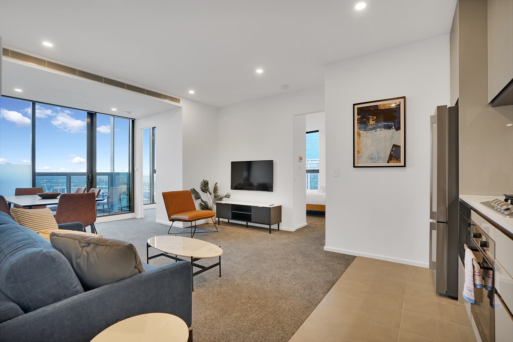 Fii binevenit în cele mai sigure și mai prestigioase clădiri rezidențiale din Melbourne - Prima Pearl. Sosiți în apartamentul înalt din cer la nivelul 58 și admirați priveliștile panoramice ale orașului prin ferestrele din podea până în tavan. Bucură-te de priveliște în timp ce te relaxezi pe o canapea secțională spațioasă și stai în pat. Pregătește mesele într-o bucătărie elegantă și completează-ți rufele cu o mașină de spălat complet funcțională și un uscător separat. Parcarea este disponibilă la o taxă de noapte de 20 $ pe noapte .